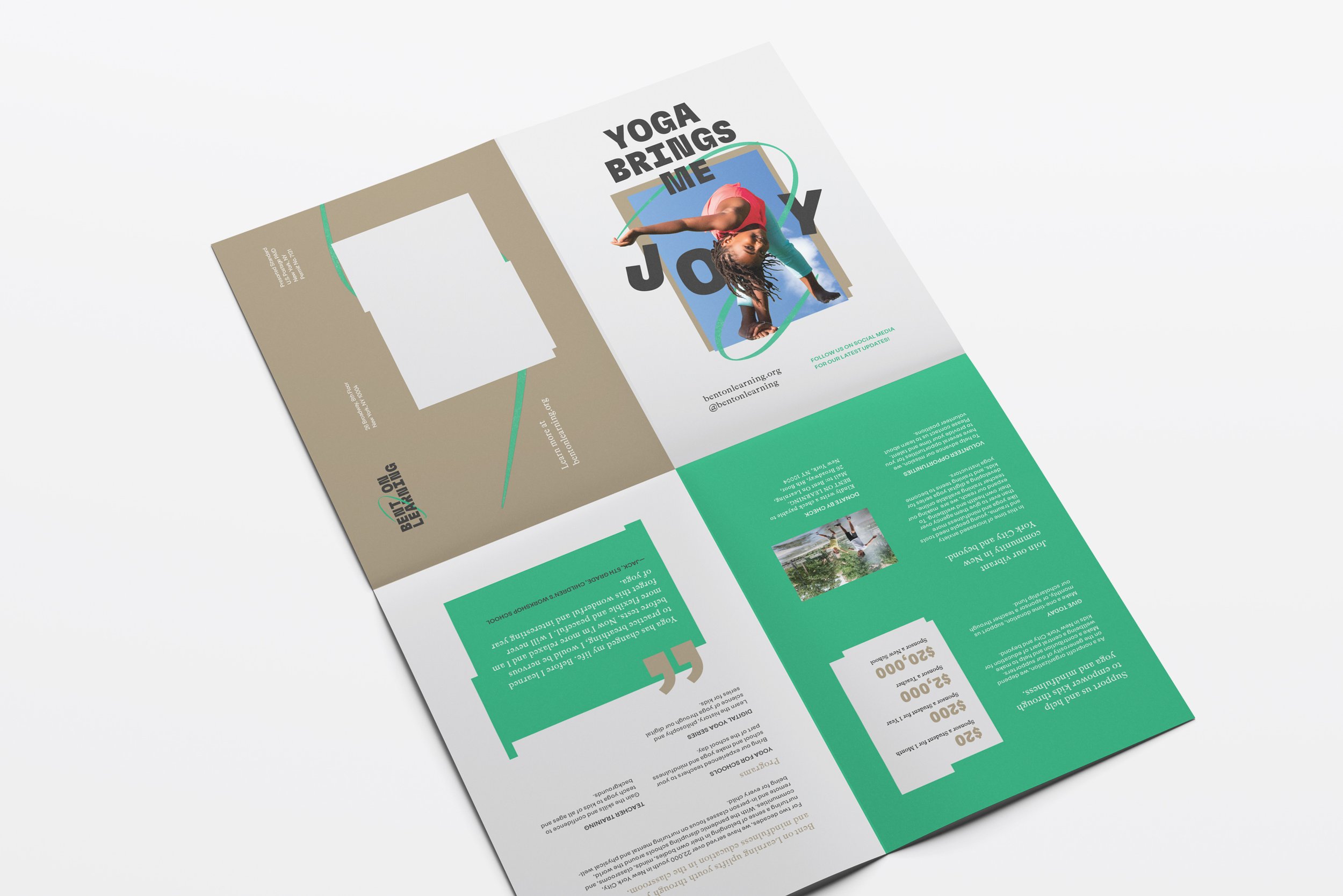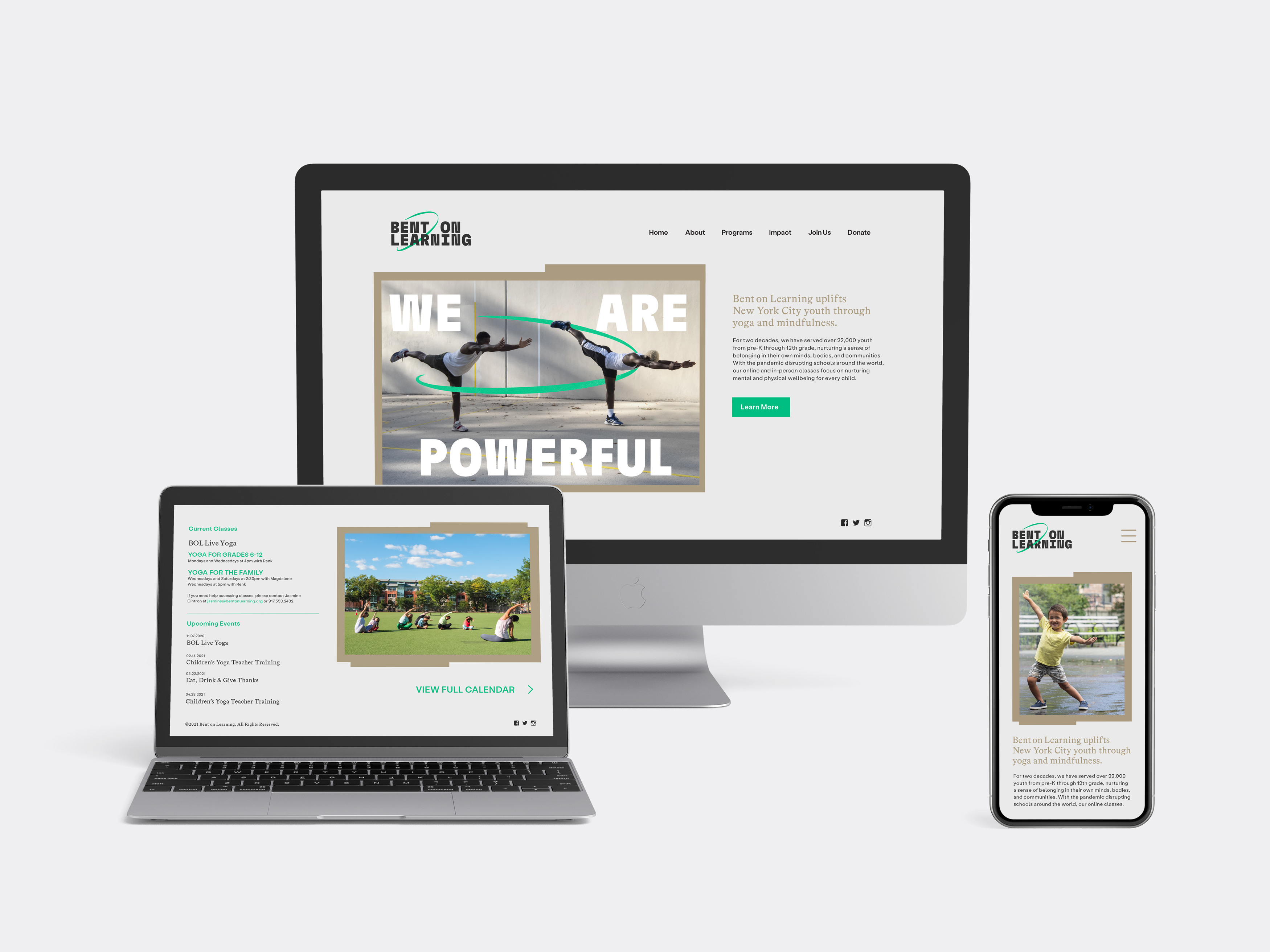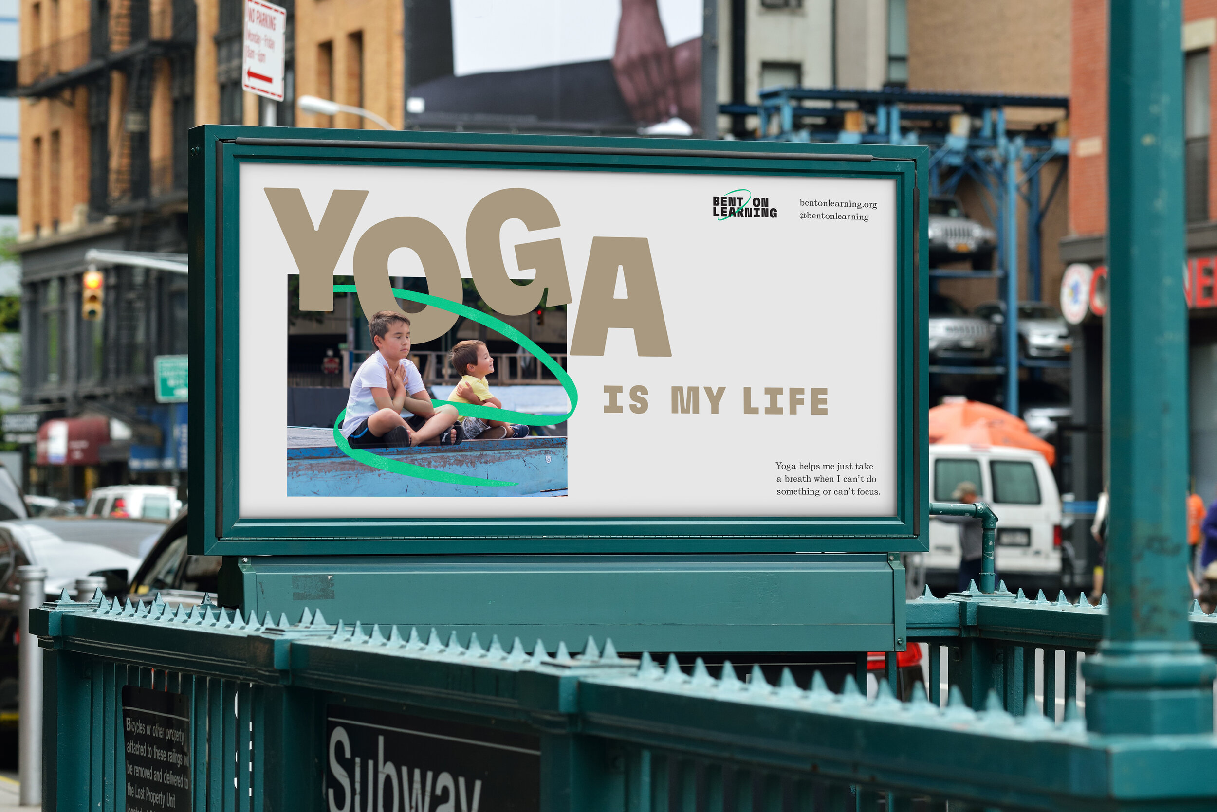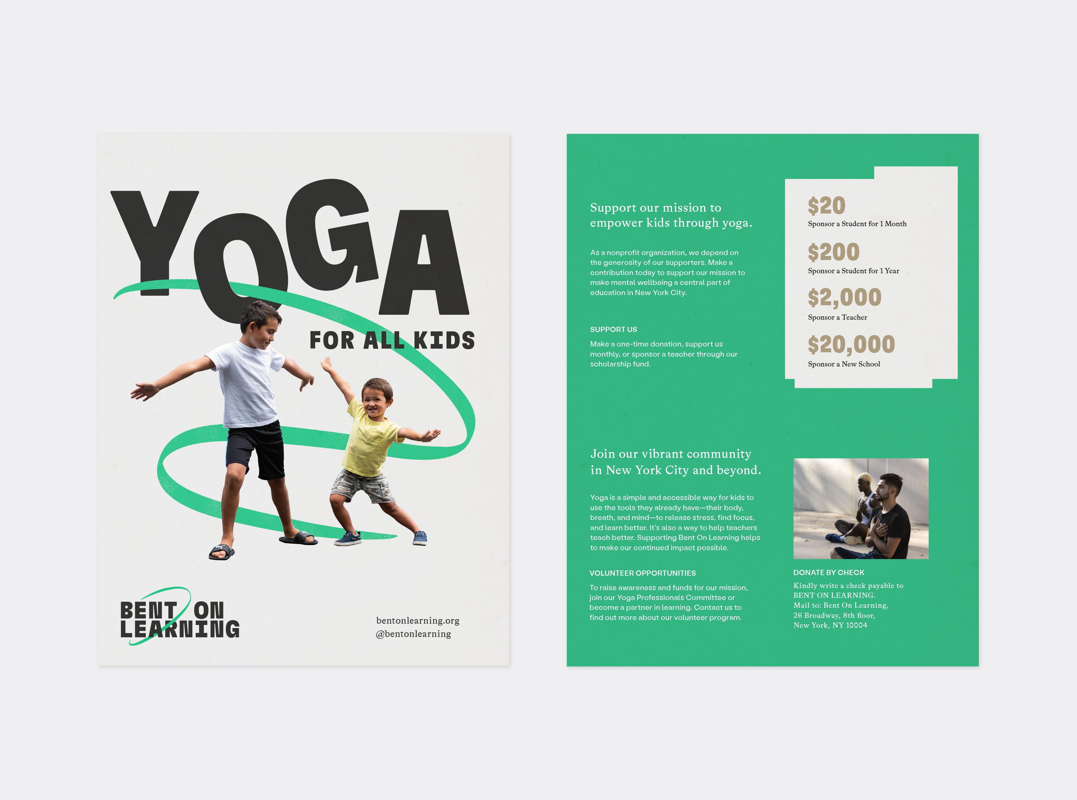 Visual identity, spatial graphics, and marketing materials for a nonprofit organization to ensure yoga is accessible to all children and families of New York City.